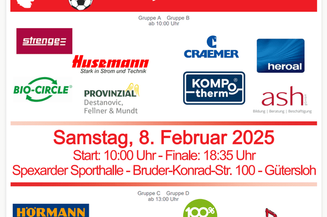 Am 8. Februar 2025 richtet der SV Spexard das 19. Firmenturnier in der Spexarder Sporthalle aus.
