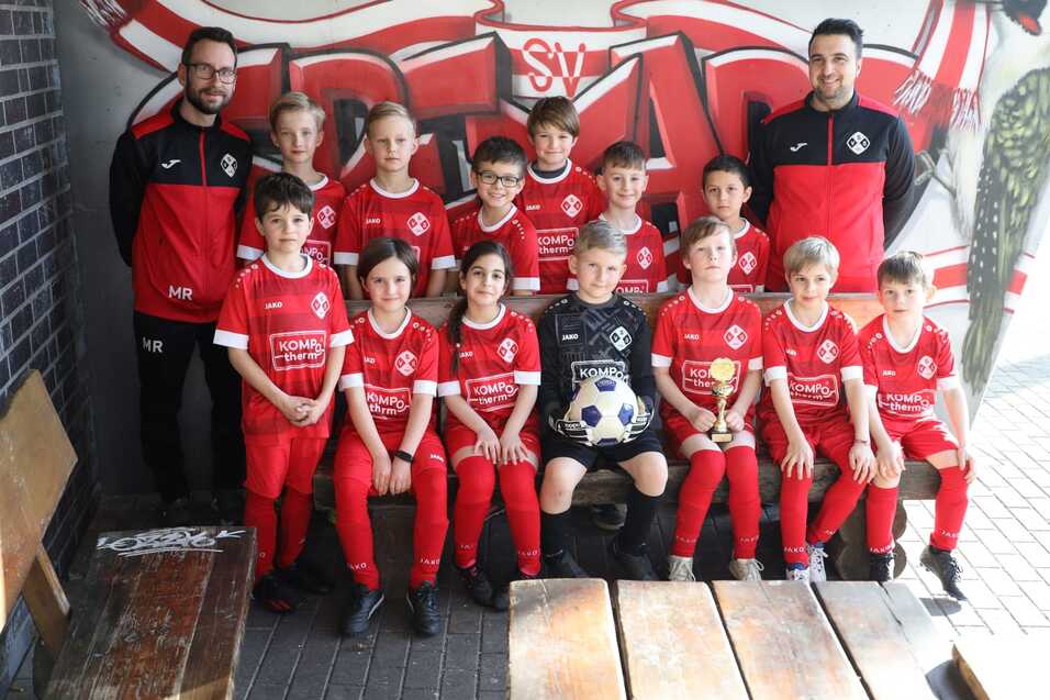 HL: Trainer Marko Raschdorf, Gustav Langer, Luke Thomas, Johannes Schur, Jonah Mertens, Lenn Lieder, Jan Roguski, Trainer Johannes Coga. VL: Kaya Wennier, Johanna Uhlig, Mariella Coga, Mats Raschdorf, Liam Ritter, Leo Oswald, Ludwig Bojovic. Es fehlen: Trainer Dominik Thomas, Denis Enache und Ianis Prozan.